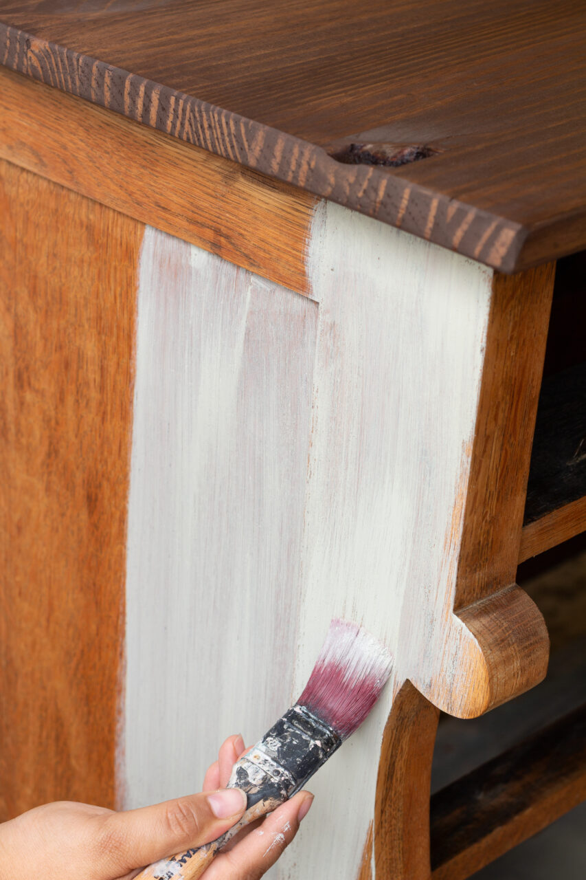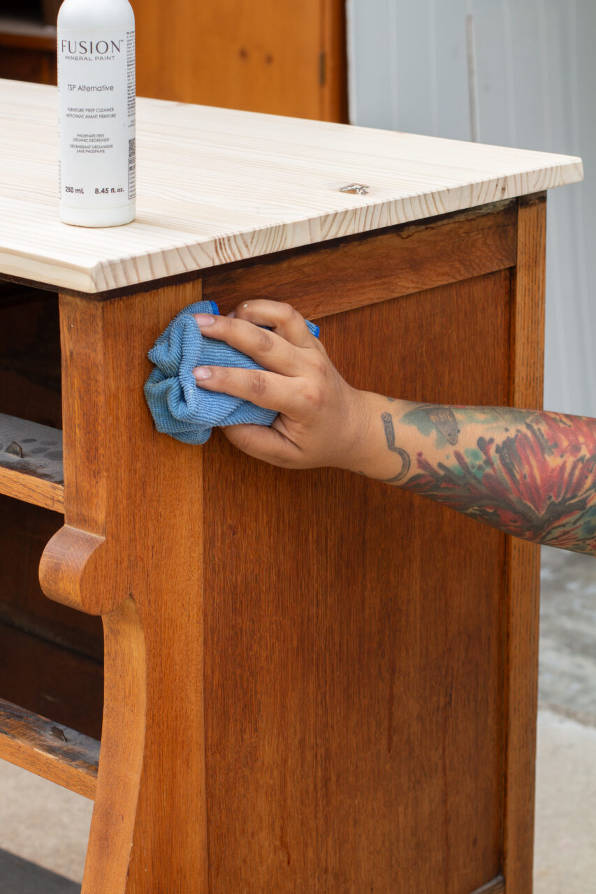 The last step in our prep was getting the piece ready for its finish. We grabbed the orbital sander to smooth out any rough spots on the new top, then wiped everything down with Fusion’s TSP Alternative to clear away sanding dust and any lingering oils or residue. For the base, we skipped the scuff sanding because we were crossing our fingers for a little chippy goodness!