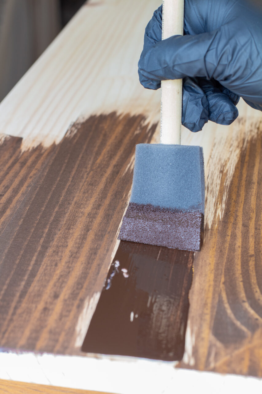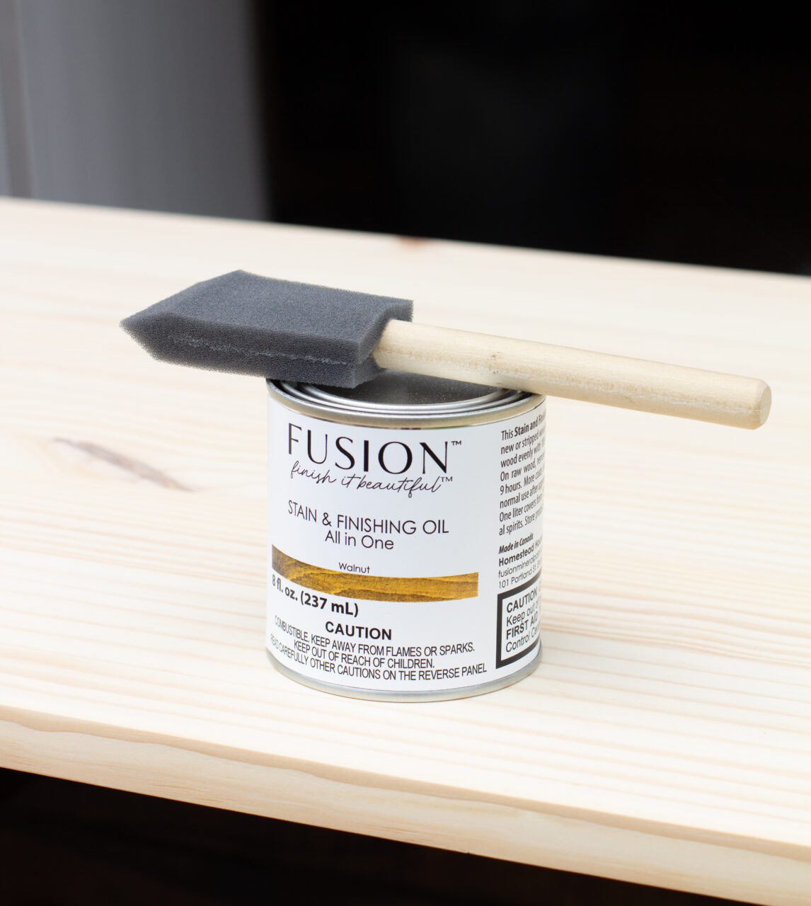 We decided to begin with the top finish since we were working with an oil-based product. Because oil finishes typically require longer drying times, starting here gave the finish ample time to cure properly. For this piece, we use one of our favourite SFO colours, Walnut. Using a foam brush, we fully saturated the surface, then wiped back the excess with a lint-free cloth. Since we were applying it to freshly sanded wood, the finish was able to penetrate deeply, resulting in a rich, warm look.