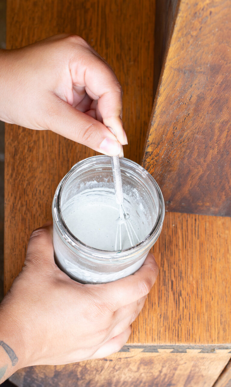 Next, we mixed up our milk paint. For this project, we wanted a soft, coastal-inspired colour with neutral tones, so we chose Bedford, a beautiful greige with subtle green undertones. To achieve full coverage, we mixed the paint slightly thicker than usual. A heavier consistency also encourages more natural crazing and crackling, which was exactly the look we were going for. We began with a 50/50 ratio of milk paint powder to water, then added an extra spoonful of powder to thicken it up. Using a mini whisk, we blended the mixture until the lumps broke down, then let it rest for a few minutes to allow the pigments to fully dissolve