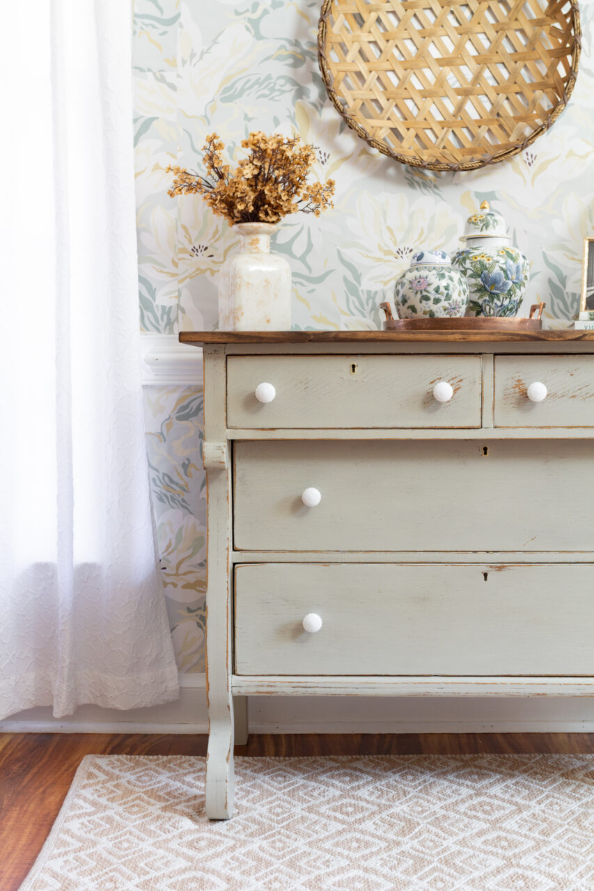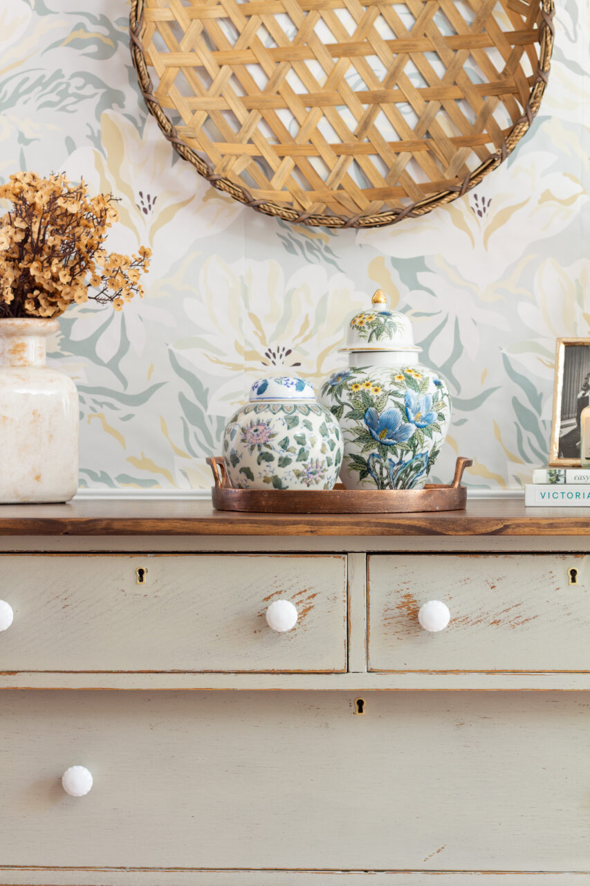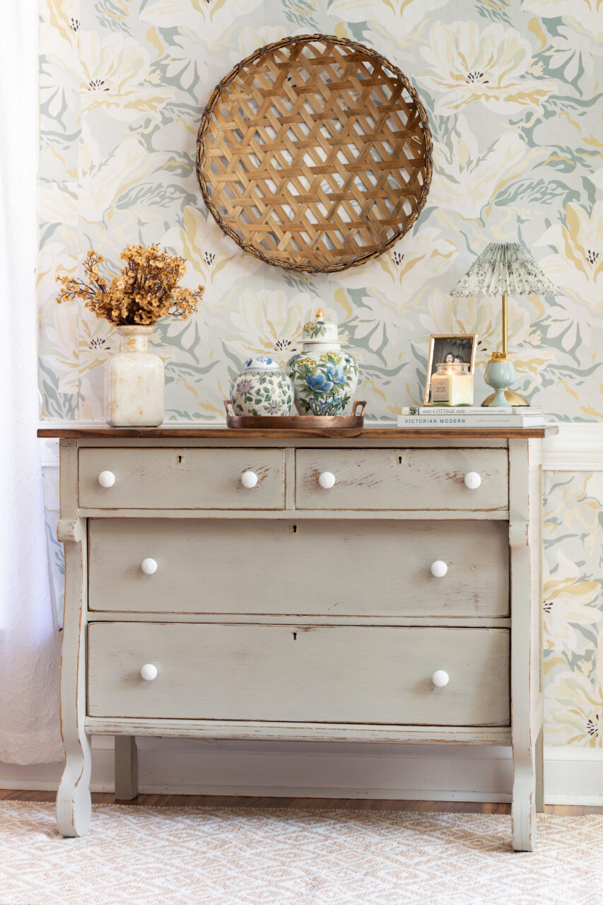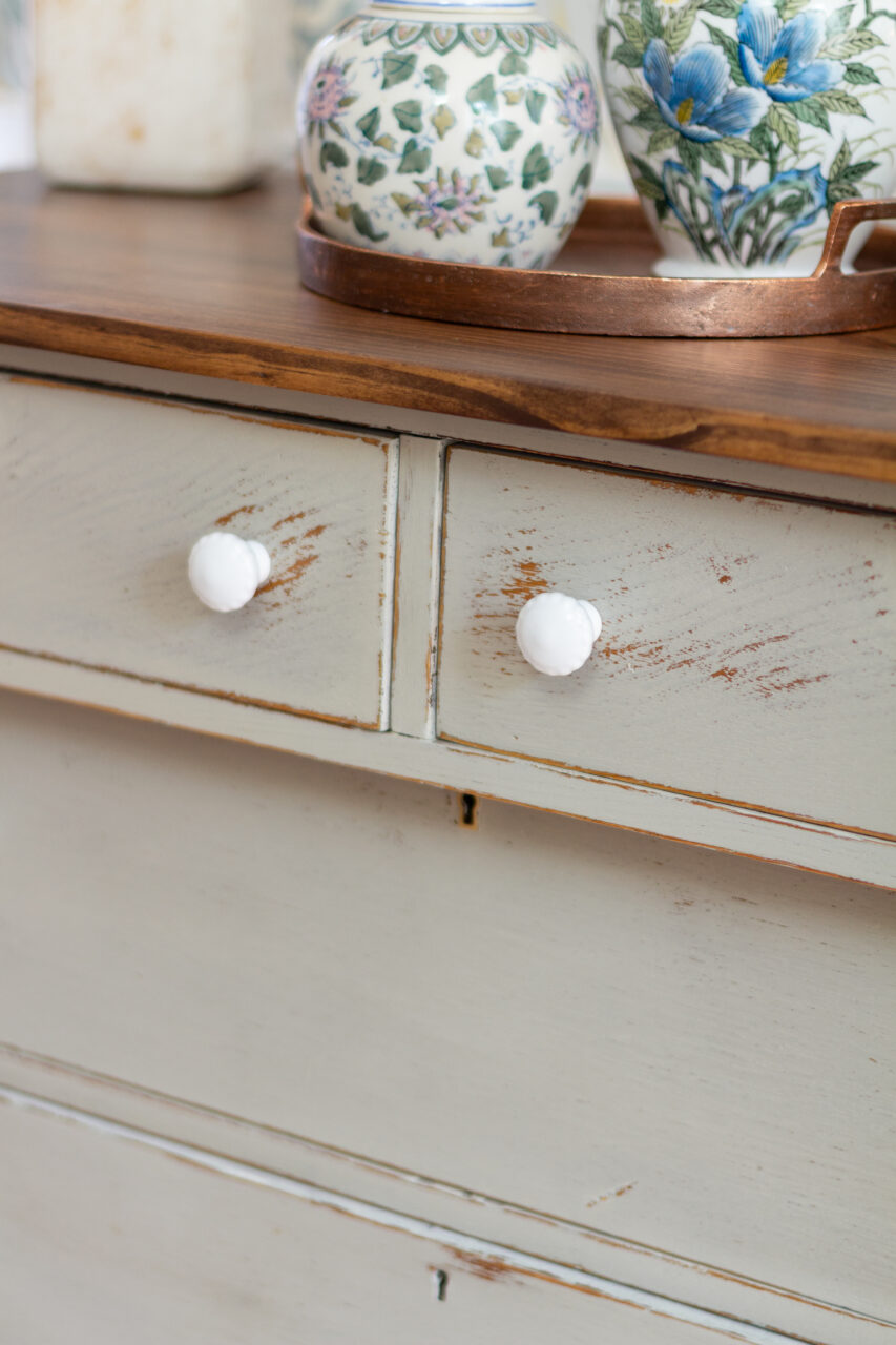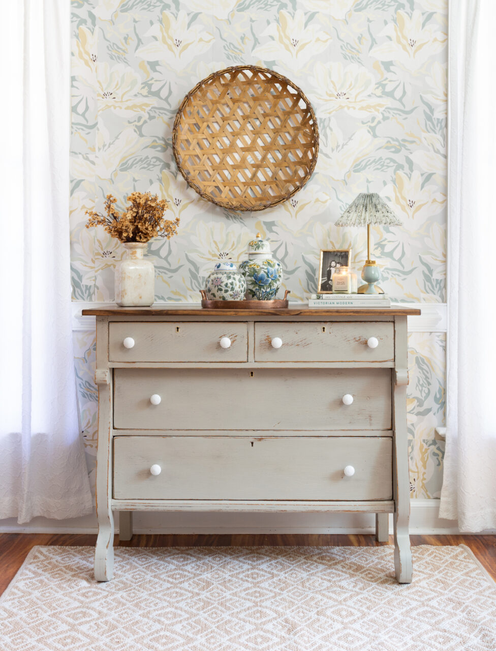 This dresser makeover highlights the beauty of simplicity and timeworn charm. The neutral hardware keeps the look understated, allowing the natural chipping and distressing of the milk paint to shine through. The surrounding décor like ginger jars, vintage-inspired pottery, and a woven basket enhances the layered, collected feel. Together, these elements create a perfectly balanced blend of rustic elegance and timeless character.