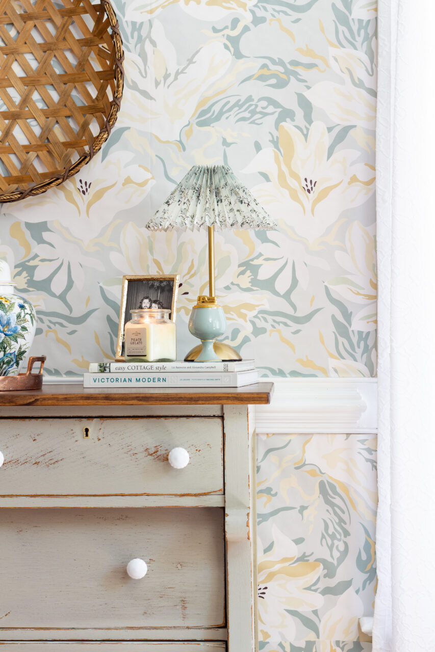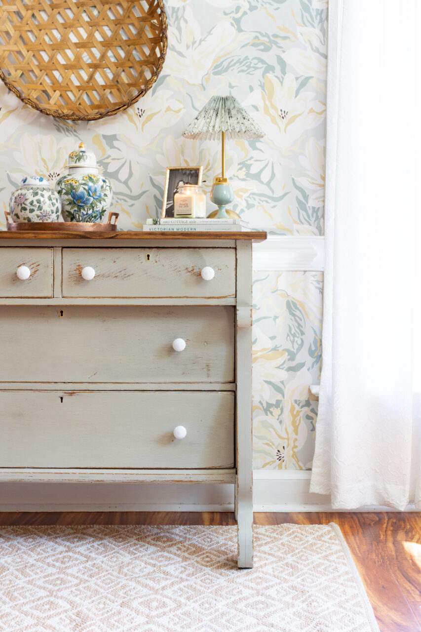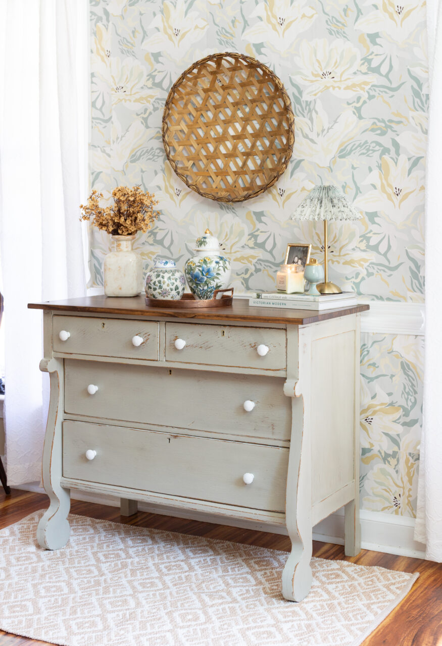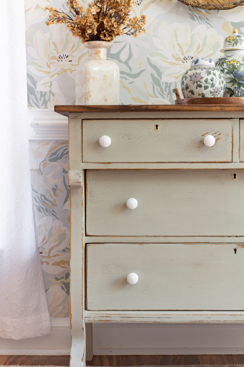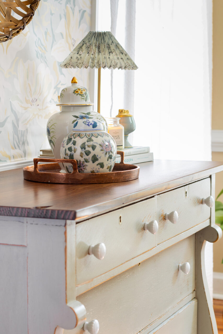 This dresser makeover highlights the beauty of simplicity and timeworn charm. The neutral hardware keeps the look understated, allowing the natural chipping and distressing of the milk paint to shine through. The surrounding décor like ginger jars, vintage-inspired pottery, and a woven basket enhances the layered, collected feel. Together, these elements create a perfectly balanced blend of rustic elegance and timeless character.
