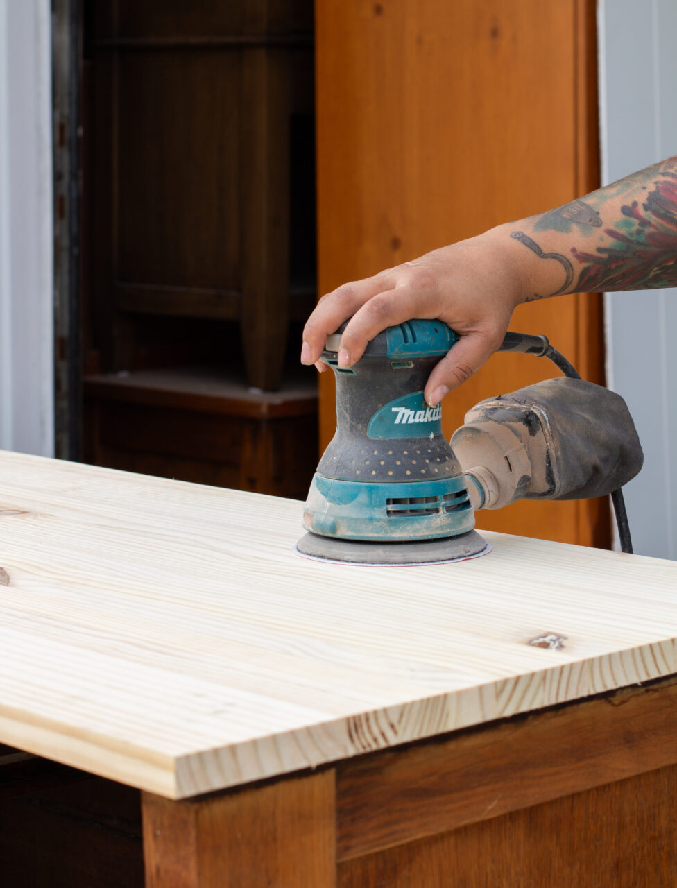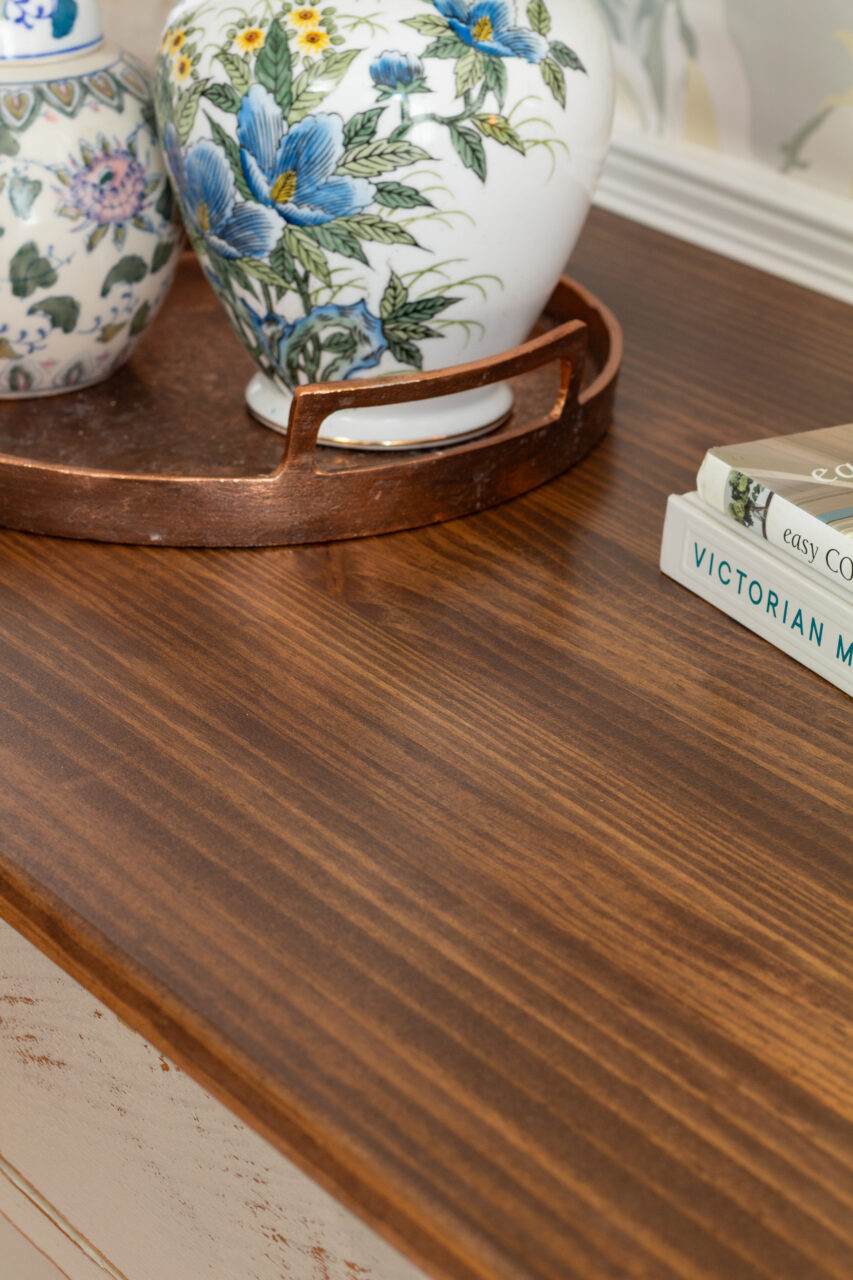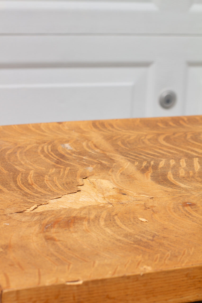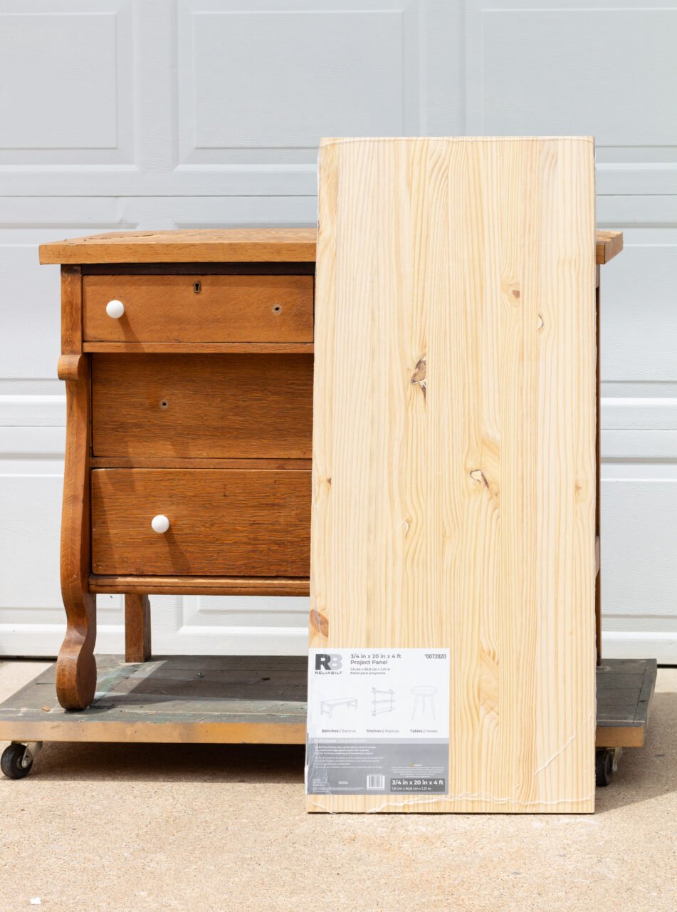 With older furniture, you’ll often find chipped veneer, and what’s hiding underneath can be hit or miss. Sometimes the wood is solid and worth saving, but other times it’s just not. And when that happens, replacing the top can actually be the best (and least stressful) solution. For this project, the top piece was beyond saving, so we opted for a brand-new plank top, giving it not only a fresh start but also a custom rustic touch.