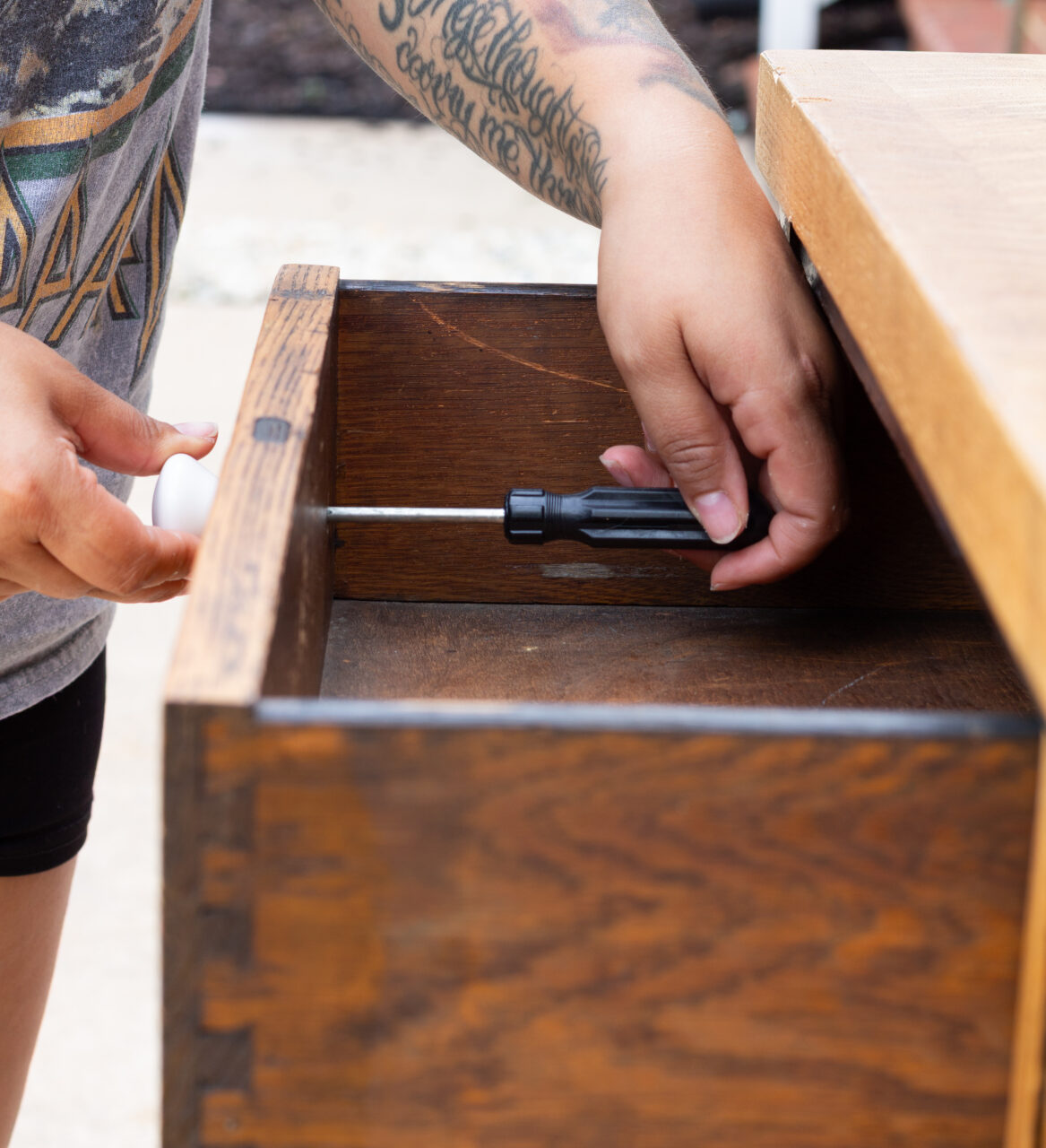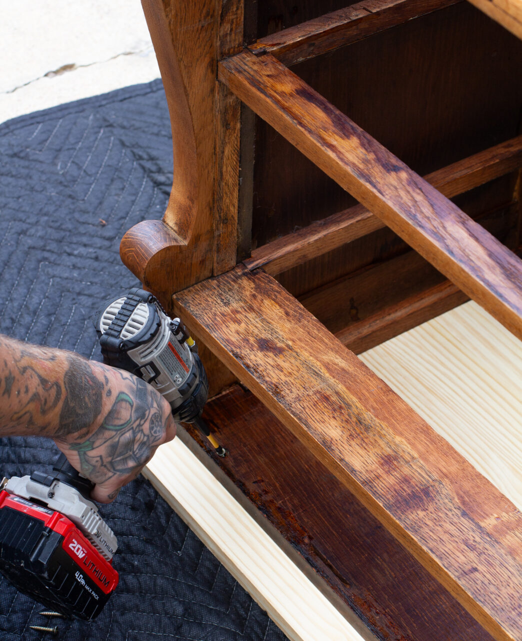 With the board cut to size, it was time to attach it. We laid the board on a blanket to protect it, then flipped the dresser upside down for easier access. Having the floor as leverage made it much simpler to apply pressure and get a solid fit. To secure the top, we used a drill with self-drilling screws for a strong hold.
