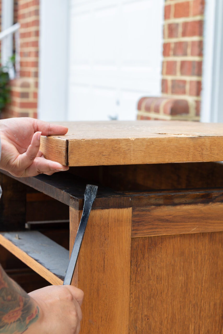 The first step is getting the piece prepped for both paint and its new top. We started by removing all the hardware from the drawers and then pulling the drawers out completely. Once that was done, it was time to tackle the old top. This one was held in place with nails, so a pry bar was the best tool to carefully work it loose.