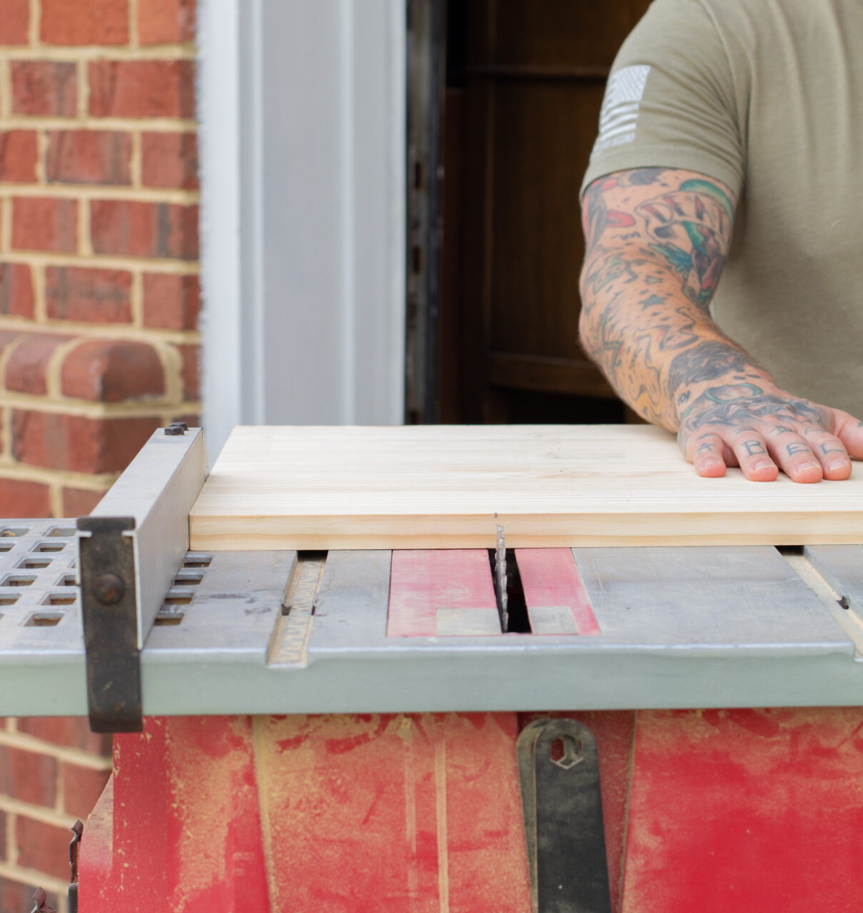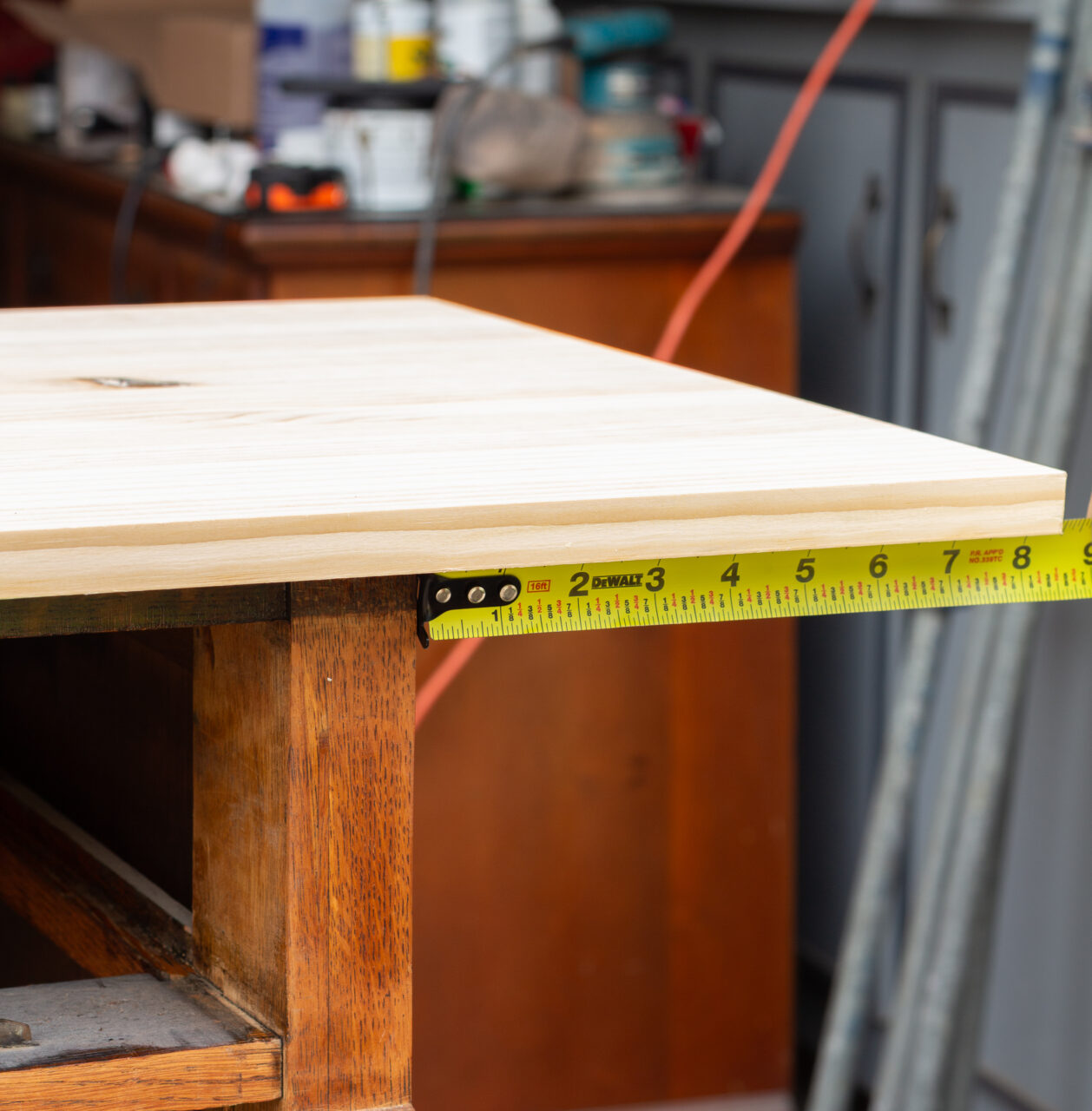 Next up was measuring and cutting the new top. We used the old top as our template, but decided to give the new one a little extra overhang for a nicer look. To keep things even, we measured each side carefully before marking our cut lines. Once everything was lined up, we ran the plank board through the table saw to get it cut to size.